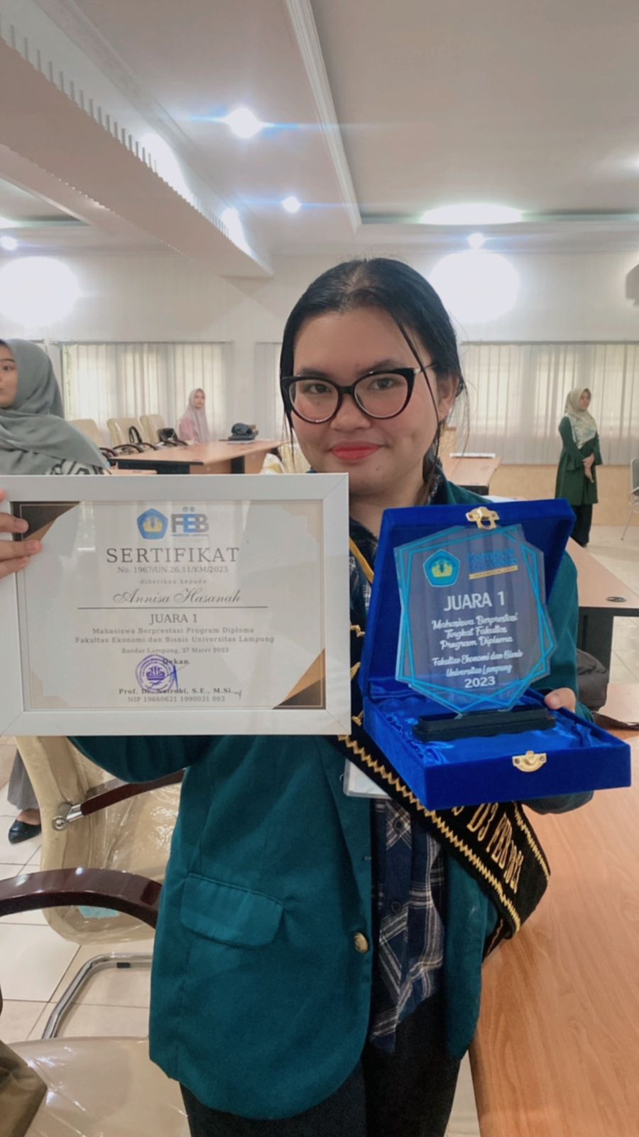 Putri bungsu dari Anggota DPRD Provinsi Lampung, Nurhasanah ini berhasil mengungguli 12 orang finalis hasil seleksi dari 21 mahasiswa yang mengikuti ajang tahunan bersaingnya mahasiswa berprestasi tingkat fakultas itu.