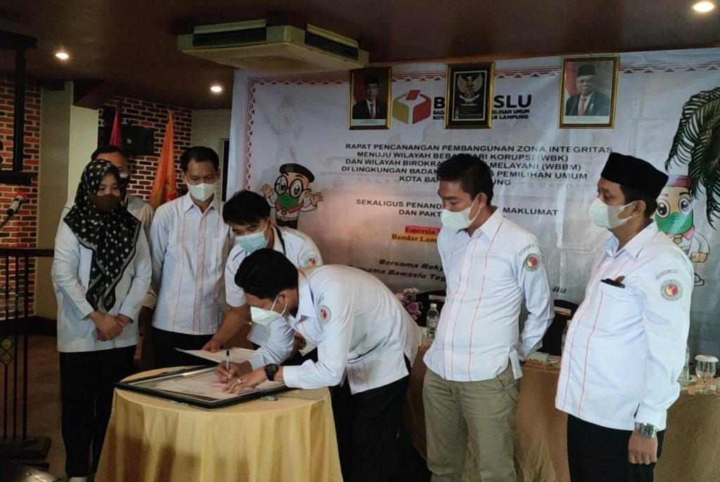 Kegiatan kemudian dilanjutkan dengan penandatanganan Maklumat dan Pakta Integritas oleh Ketua dan Anggota Bawaslu Kota Bandar Lampung serta Kepala Sekretariat Bawaslu Kota Bandar Lampung.