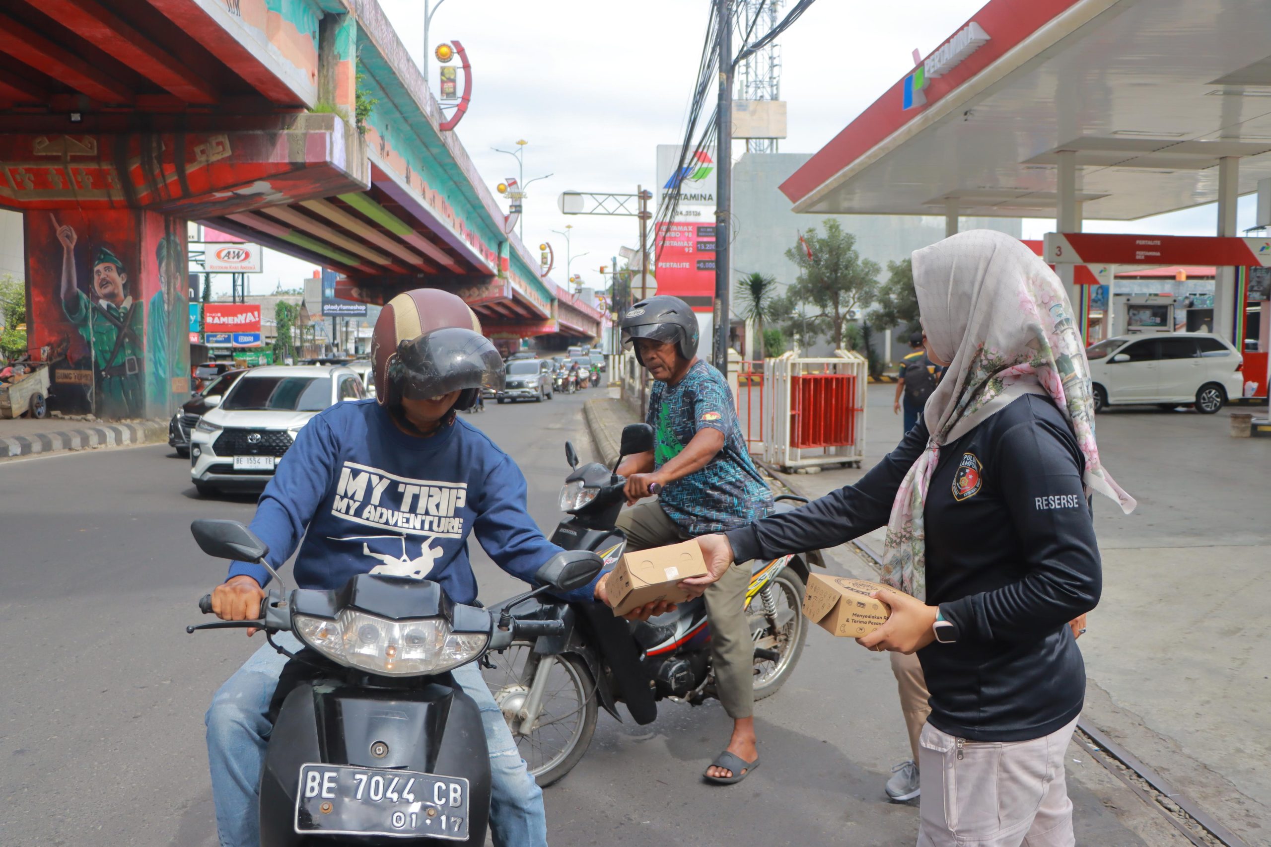 Pembagian takjil berupa makanan dan minuman berbuka puasa tersebut menyasar sejumlah pengendara lalu lintas hingga masyarakat membutuhkan di sejumlah ruas jalan protokol Kota Bandar Lampung.