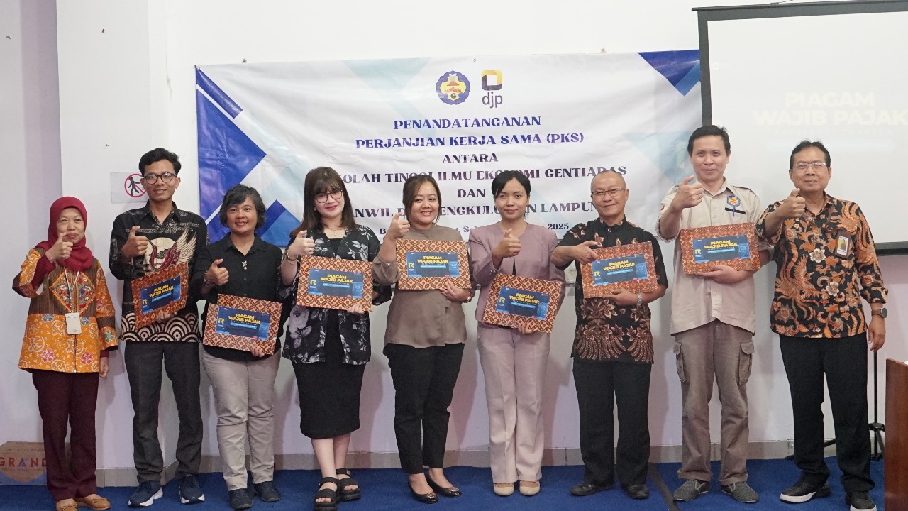 Bandar Lampung – Kanwil DJP Bengkulu dan Lampung menyerahkan Piagam Wajib Pajak (Taxpayers’ Charter) sebagai bentuk penghargaan kepada STIE Gentiaras atas komitmennya dalam mendukung pendidikan dan kesadaran perpajakan. Penyerahan Piagam dilakukan oleh Kepala Kanwil DJP Bengkulu dan Lampung, Retno Sri Sulistyani, pada acara yang berlangsung di Ruang Kerja Kepala STIE Gentiaras, Kota Bandar Lampung.