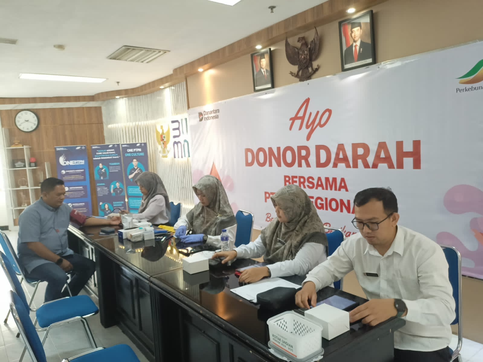 Donor darah berlangsung di ruang rapat utama (Ruang Harmonis) Gedung Kantor Regional di Bandar Lampung, Rabu (9/7/25). Sebanyak 70 kantong darah terhimpun dari karyawan yang bertugas di Kantor Regional, Unit Kerja Kebun Bergen, Kebun Way Berulu, dan Kebun Pematang Kiwah. Palang Merah Indonesia (PMI) Unit Transfusi Darah Bandar Lampung, para pendonor datang dengan sukarela setelah mendapat undangan dari panitia.