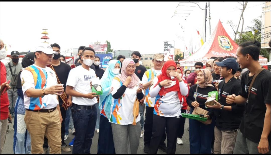BANDAR LAMPUNG—Di tengah kelimun warga yang menikmati suasana Car Free Day di Kawasan Tugu Adipura, Walikota Bandarlampung Eva Dwiana menyempatkan singgah di lapak FKPPIB. Anak-anak karyawan BUMN itu melakukan door stop kepada Bunda Eva, sapaan akrab istri Herman HN itu untuk mencicipi teh hangat yang diseduh dari teh hitam merek Gunung Dempo yang produksi PTPN VII, Ahad (25/9/22).