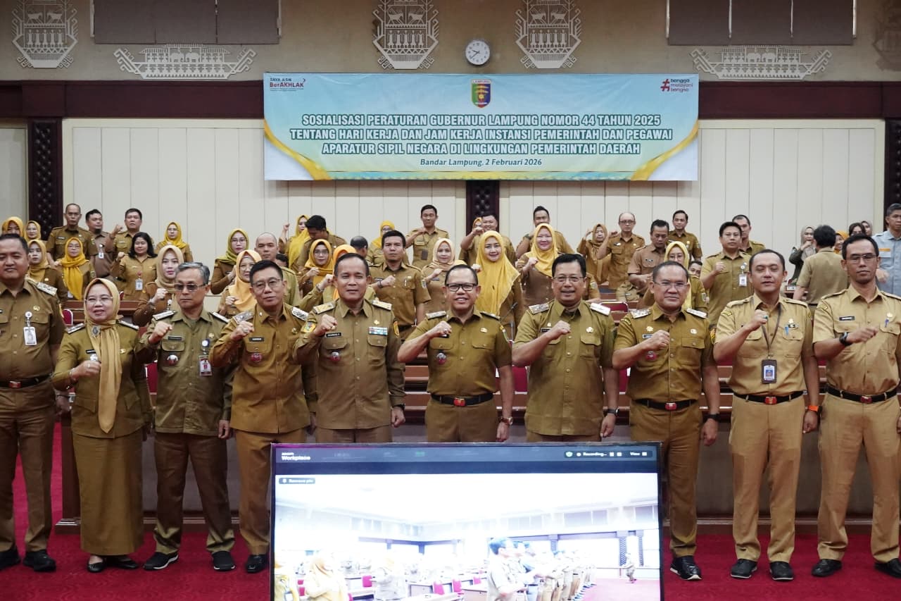Bandarlampung — Pemerintah Provinsi Lampung menggelar sosialisasi Peraturan Gubernur (Pergub) Nomor 44 Tahun 2025 tentang Hari Kerja dan Jam Kerja Instansi Pemerintah dan Pegawai Aparatur Sipil Negara (ASN) di lingkungan Pemerintah Daerah. Acara tersebut dibuka oleh Gubernur Lampung yang diwakili oleh Asisten Administrasi Umum, Sulpakar, di Gedung Pusiban, Senin (2/2/2026).