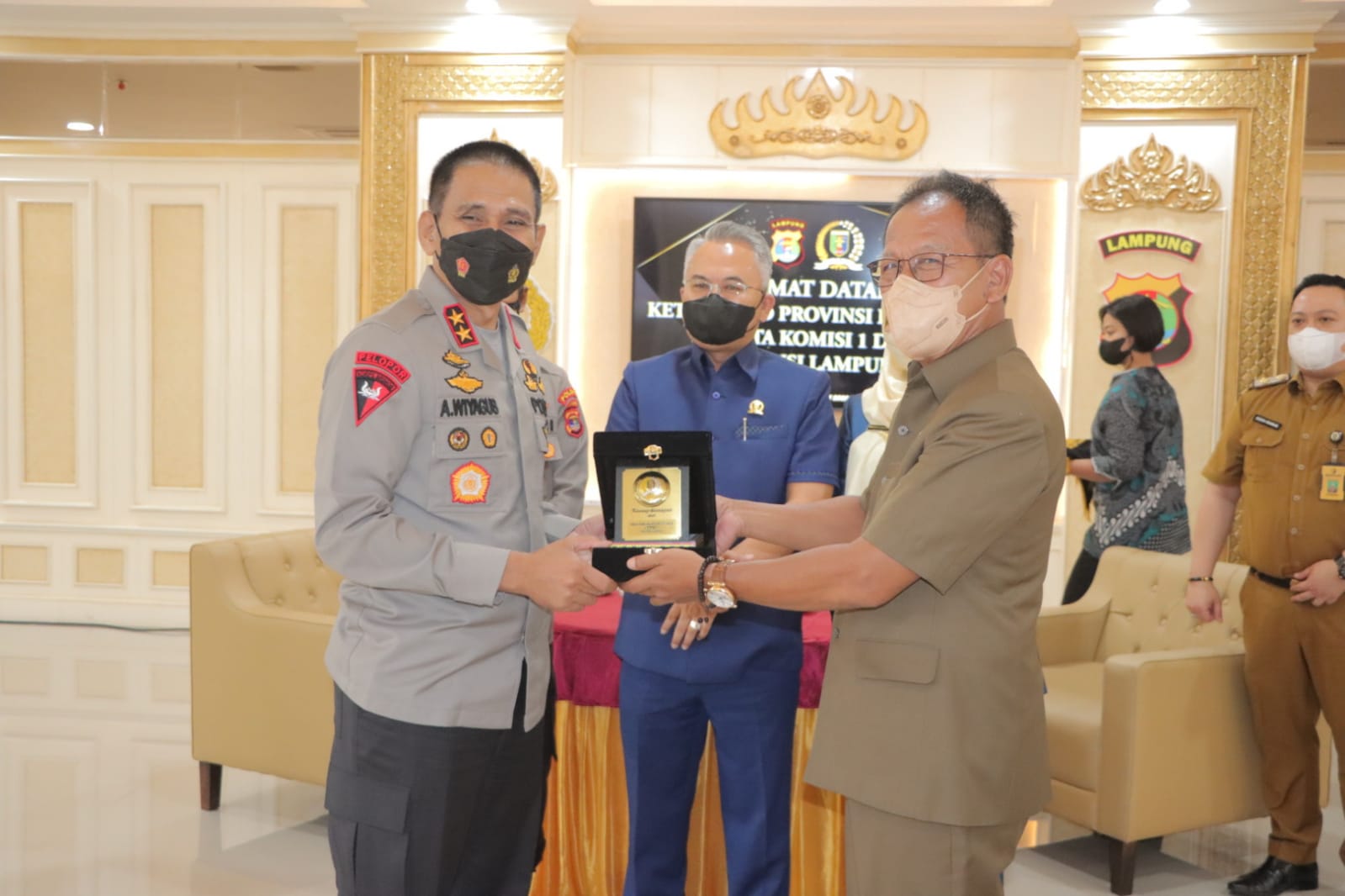 Bandarlampung – Kapolda Lampung Irjen Pol. Akhmad Wiyagus, didampingi Wakapolda Brigjen Pol. Subiyanto beserta Pejabat Utama, menerima Kunjungan Kerja Ketua DPRD Provinsi Lampung, Mingrum Gumay bersama Anggota Komisi I DPRD Provinsi Lampung, bertempat di Aula Siger Lounge Polda Lampung, Selasa (9/8).