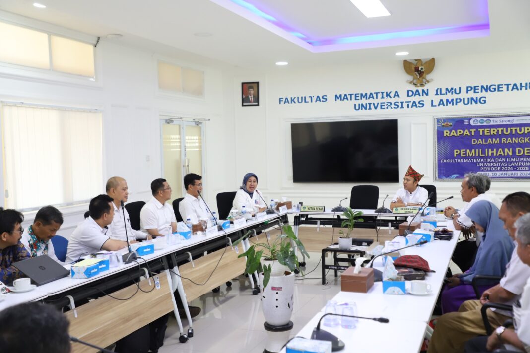 Proses pemilihan dekan untuk periode 2024—2028 berlangsung di Ruang Sidang Dekanat lantai dua FMIPA, dipimpin Ketua Senat Dr. Junaidi, S.Si., M.Sc., dan juga dihadiri Rektor Unila Prof. Dr. Ir. Lusmeilia Afriani, D.E.A., IPM., ASEAN Eng., bersama seluruh anggota senat FMIPA Unila.