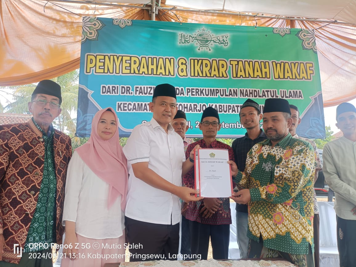 Pringsewu – Bakal Calon Bupati Pringsewu yang juga Wakil Bupati Pringsewu Periode 2017 – 2024 DR H. Fauzi, SE, M.Kom, A.Kt, C.A.MA mewakafkan sebidang tanah miliknya kepada perkumpulan Nahdlatul Ulama Kecamatan Sukoharjo.