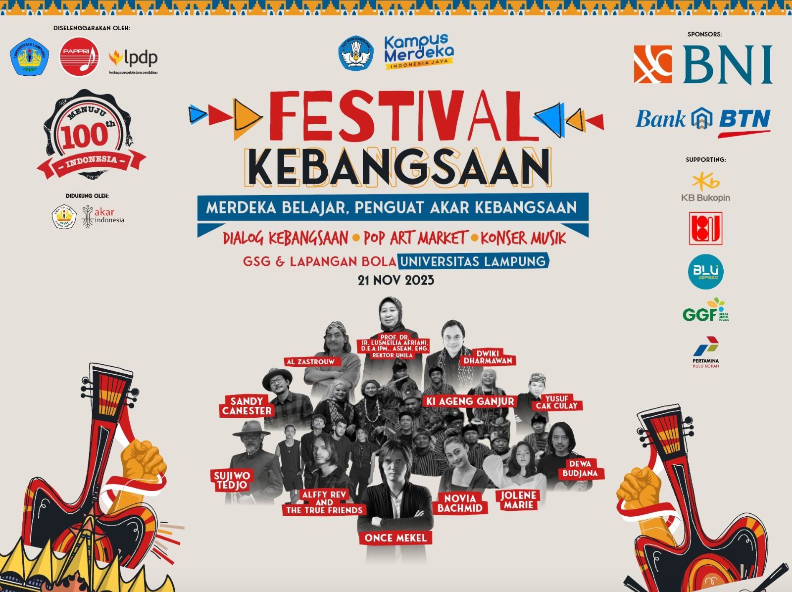 Bandarlampung – Dalam rangka memperingati Hari Pahlawan, Universitas Lampung (Unila) bekerja sama dengan Persatuan Artis Penyanyi, Pencipta Lagu, dan Pemusik Republik Indonesia (Pappri) akan menyelenggarakan event “Festival Kebangsaan”, pada Selasa, 21 November 2023, di kampus Unila, Bandar Lampung.