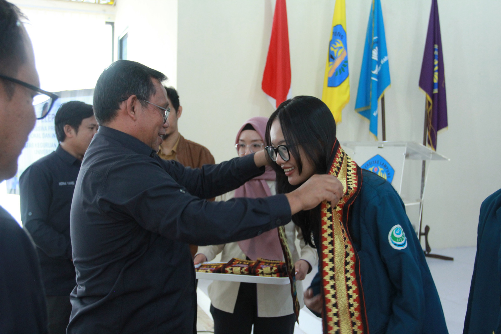 Sebagai simbol pelepasan, Prof. Dr. Sunyono, M.Si. melakukan pengalungan selempang tapis, kain tradisional khas Lampung, kepada para mahasiswa peserta program MBKM. Pengalungan ini melambangkan harapan agar para mahasiswa bisa mengharumkan nama FKIP Unila, baik di tingkat nasional maupun internasional.