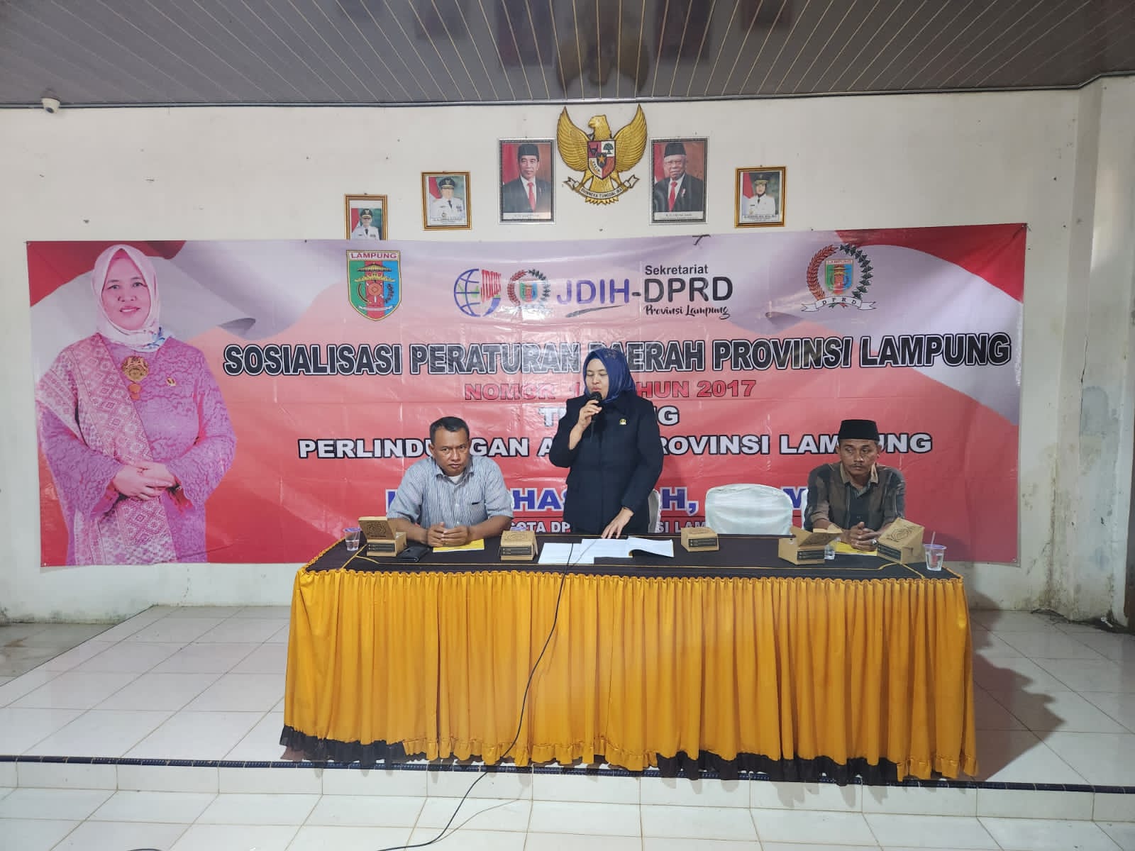 Pringsewu – Anggota DPRD Provinsi Lampung, Hj. Nurhasanah, S.H., M.H. menggelar Sosialisasi Peraturan Daerah Provinsi Lampung Nomor 13 Tahun 2017 Tentang Perlindungan Anak Provinsi Lampung di Pekon Bumi Arum Kecamatan Pringsewu Kabupaten Pringsewu, Sabtu (4/3).