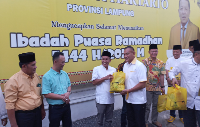 Penyerahan bingkisan lebaran untuk kader Golkar diserahkan secara simbolis oleh Sekjen Partai Golkar Lodewijk F Paulus dan Ketua DPD Partai Golkar Lampung Arinal Djunaidi kepada para Ketua DPD Partai Golkar Kabupaten/Kota se-Provinsi Lampung, dalam acara silaturrahmi dan buka puasa bersama di Posko Airlangga Hartarto, di Jl. Mas Mansur Rawalaut Bandarlampung, Sabtu (14/4/2023).