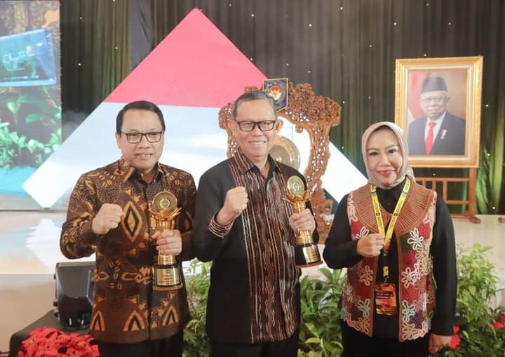 Jakarta — Gubernur Lampung Arinal Djunaidi diwakili oleh Sekdaprov Lampung, Fahrizal Darminto menerima penghargaan Wanua Upakarya Nugraha dari Direktorat Jendral Bina Pemerintahan Desa Kementerian Dalam Negeri dalam Acara Temu Karya Nasional dan Penganugerahan Penghargaan Kepada Desa dan Kelurahan Berprestasi tahun 2023 di Hotel Discovery Jakarta, Selasa (15/8/2023) malam.