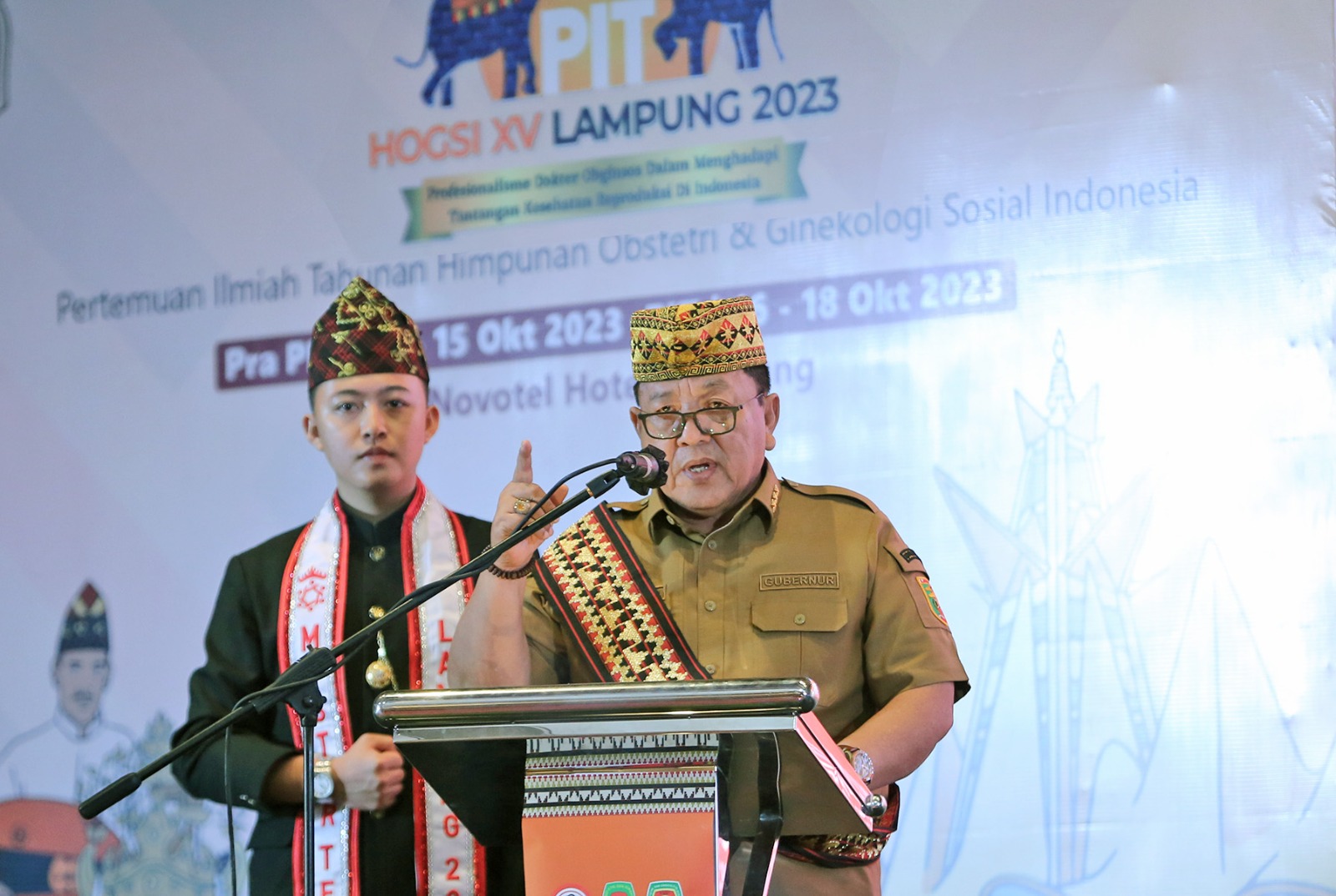 Bandarlampung – Gubernur Lampung Arinal Djunaidi Membuka Acara Pertemuan Nasional Ilmiah Tahunan Himpunan Obstetri dan Ginekologi Sosial (PIT HOGSI) XV, yang berlangsung di Ballroom Hotel Novotel, Bandar Lampung, Senin (16/10/2023).