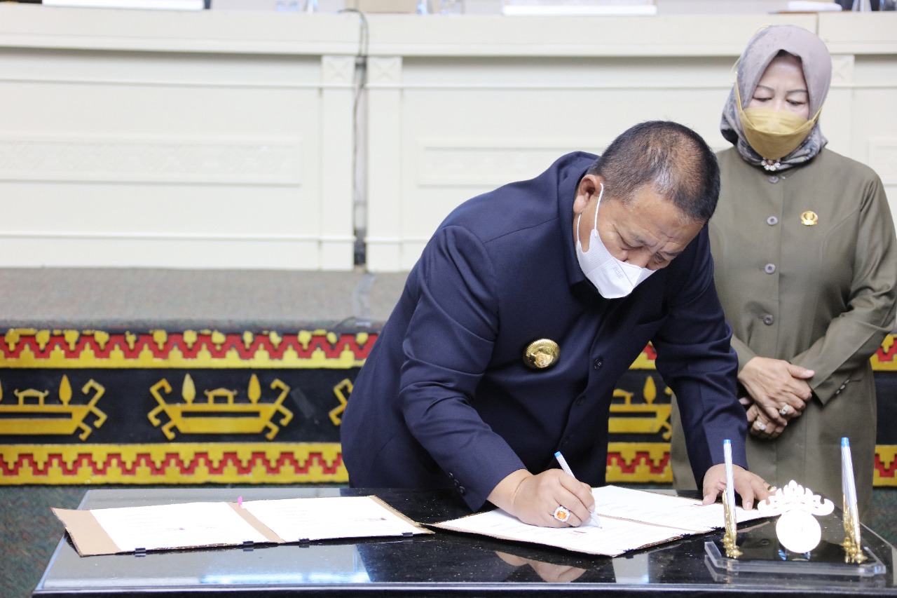 BANDARLAMPUNG – Gubernur Lampung Arinal Djunaidi dan Ketua DPRD Provinsi Lampung Mingrum Gumay, yang diwakili Wakil Ketua I DPRD Provinsi Lampung Elly Wahyuni menandatangani Nota Kesepakatan Kebijakan Umum APBD (KUA) dan Prioritas Plafon Anggaran Sementara (PPAS) Provinsi Lampung tahun 2023 di Ruang Sidang DPRD Provinsi Lampung Jumat (14/10/2023).