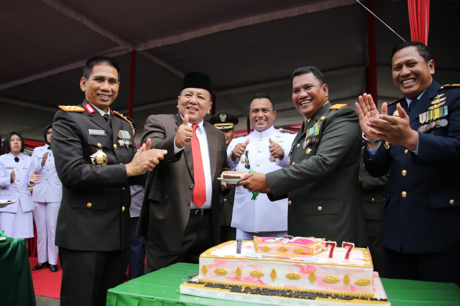 Bandarlampung – Gubernur Lampung Arinal Djunaidi dan seluruh unsur Forkopimda menghadiri Upacara Peringatan HUT TNI ke -77 di Lapangan Saburai Korem 043/Gatam, Bandar Lampung, Rabu (5/10).