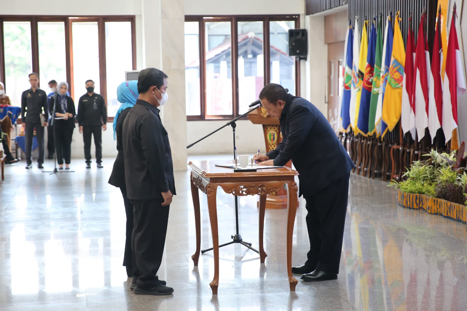 Bandarlampung – Gubernur Lampung Arinal Djunaidi mengukuhkan Kepala Perwakilan Badan Pemeriksa Keuangan dan Pembangunan (BPKP) Provinsi Lampung Suryasih Fifi Herawati di Aula Mahan Agung, Selasa (8/11).