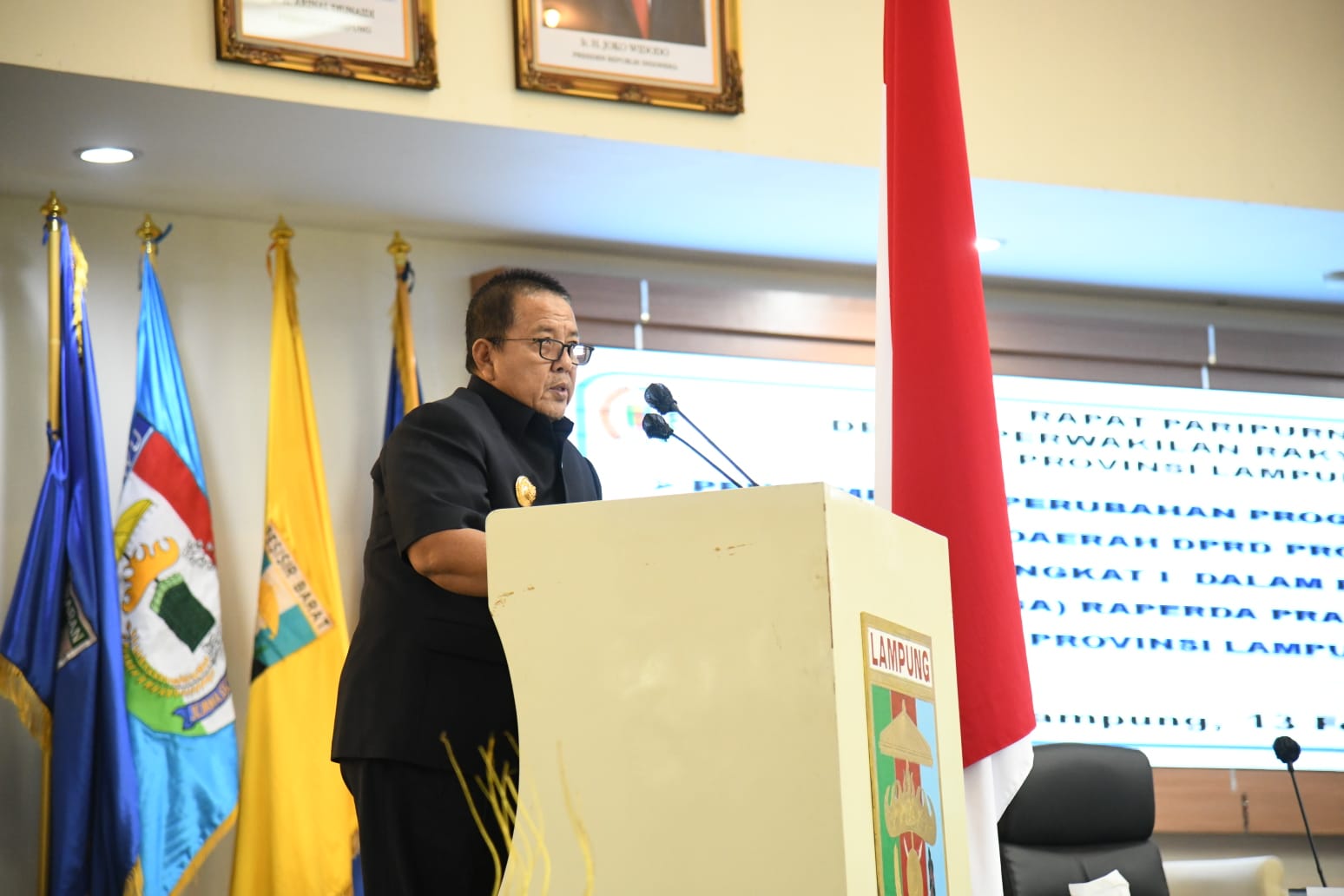 Bandarlampung – Gubernur Lampung Arinal Djunaidi menghadiri Rapat Paripurna DPRD Provinsi Lampung dalam rangka Penyampaian Perubahan Program Pembentukan Peraturan Daerah (Perda) DPRD Provinsi Lampung Tahun Anggaran 2023 dan Pembicaraan Tingkat I Dalam Rangka Penyampaian Terhadap 3 (Tiga) Raperda Prakarsa Pemerintah Provinsi Lampung bertempat di Ruang Sidang DPRD Provinsi Lampung, Senin (13/02).
