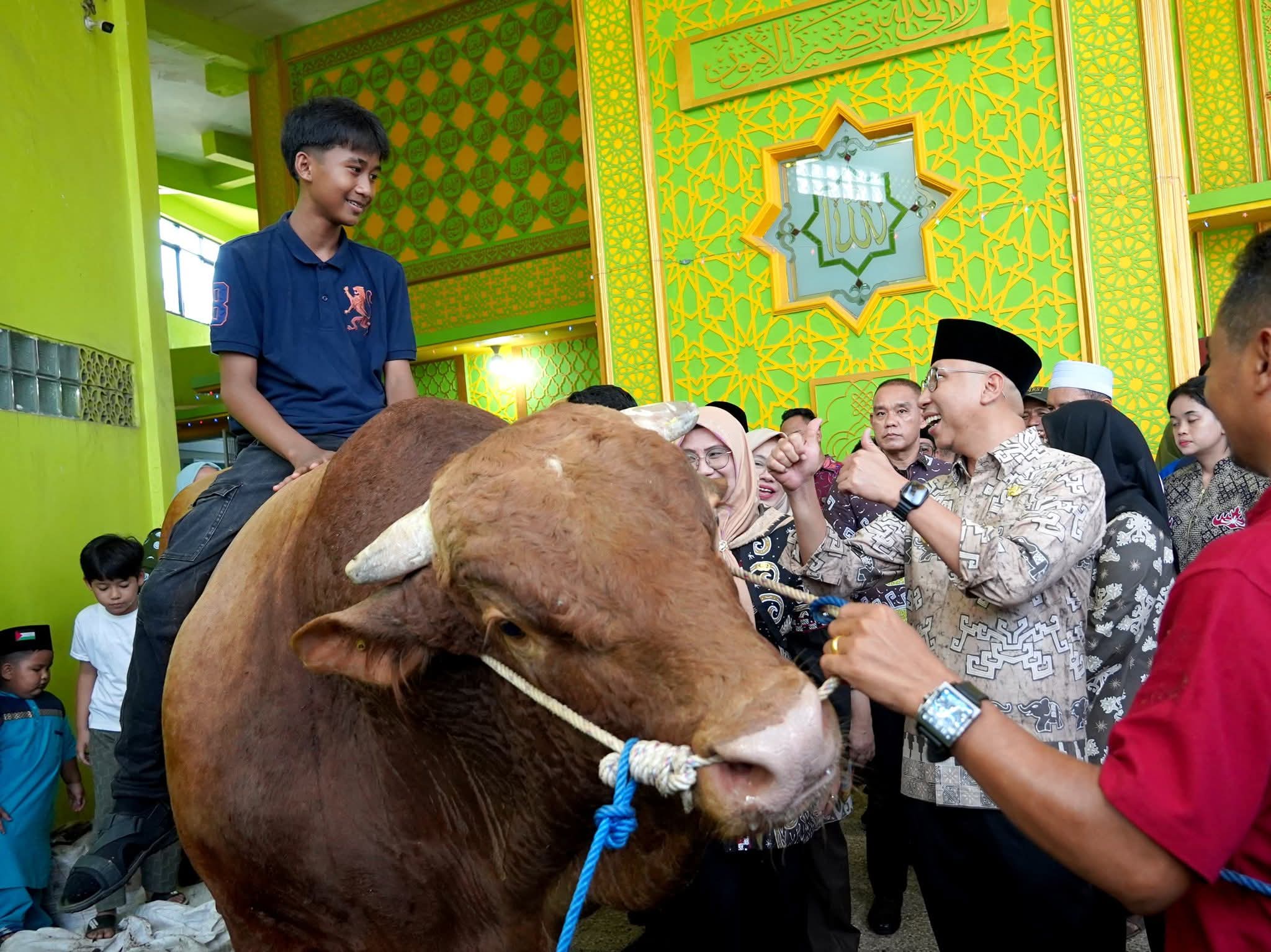 BANDARLAMPUNG — Gubernur Lampung, Rahmat Mirzani Djausal, menyerahkan secara simbolis seekor sapi kurban bantuan kemasyarakatan dari Presiden Republik Indonesia kepada pengurus Masjid Jami Nurussa’adah, Kelurahan Panjang Utara, Kota Bandar Lampung, Kamis (5/6/2025).