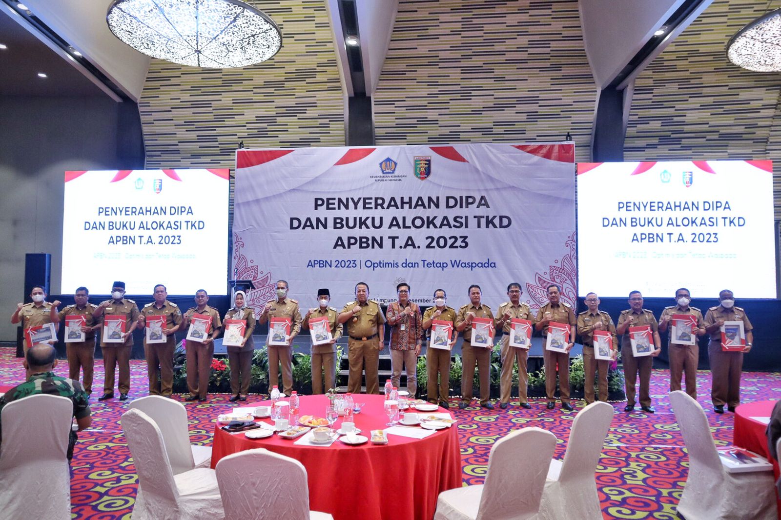 Bandarlampung – Gubernur Lampung Arinal Djunaidi menyerahkan Daftar Isian Pelaksanaan Anggaran (DIPA) dan Buku Alokasi Transfer Ke Daerah (TKD) Tahun Anggaran 2023 kepada Satuan Kerja Kementerian/Lembaga (K/L) di Provinsi Lampung serta Perangkat Daerah (OPD) dan Kabupaten Kota se- Provinsi Lampung, di Ballroom Hotel Novotel Bandarlampung, Selasa (6/12).