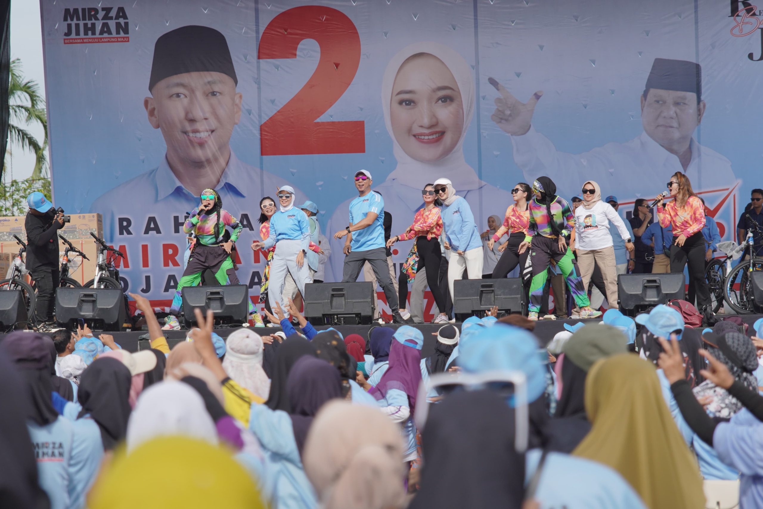 Lampung Tengah – Pasangan calon Gubernur dan Wakil Gubernur Lampung nomor urut 2, Rahmat Mirzani Djausal (Mirza) dan dr. Jihan Nurlela, senam bersama di Lapangan Kaliungu, Kalirejo, Lampung Tengah. Kegiatan ini menjadi momen spesial bagi pasangan Mirza-Jihan untuk menyapa masyarakat dan menyampaikan komitmen mereka terhadap pembangunan Lampung, khususnya Lampung Tengah.