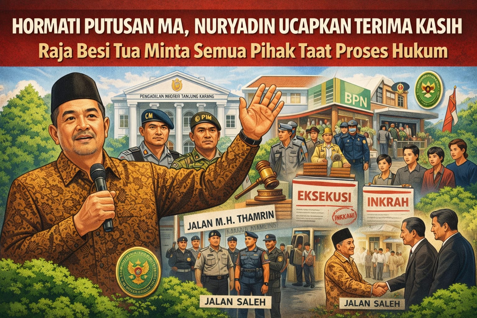 Bandar Lampung — Haji Nuryadin akhirnya angkat bicara terkait pelaksanaan sita eksekusi berdasarkan putusan Mahkamah Agung (MA) yang telah berkekuatan hukum tetap. Ia menyampaikan apresiasi kepada seluruh pihak yang telah menjalankan proses hukum secara tertib dan kondusif.