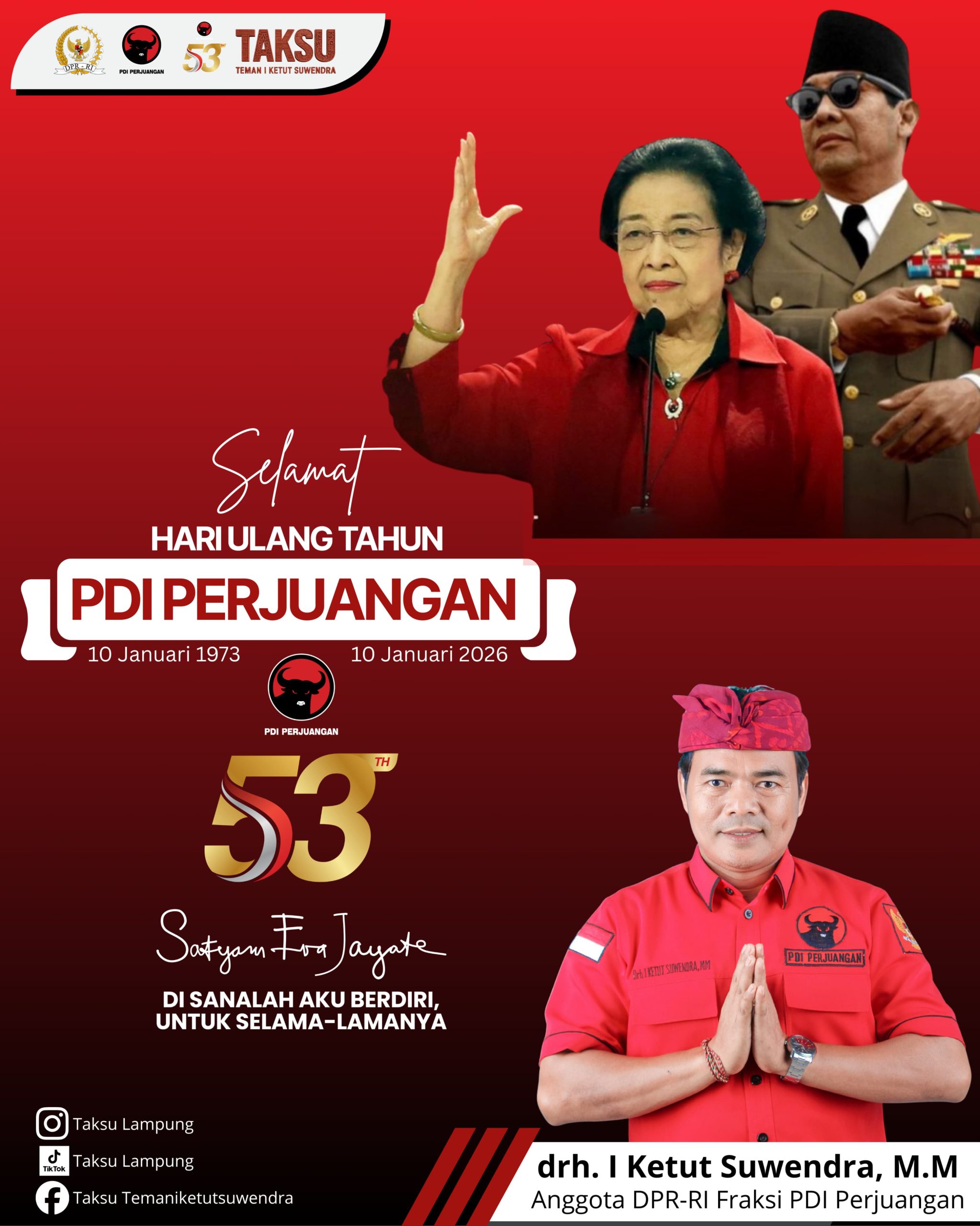 Anggota Komisi IV DPR Fraksi PDI Perjuangan, Drh. I Ketut Suwendra, MM menyampaikan ucapan selamat Hari Ulang Tahun ( HUT ) ke-53 PDI Perjuangan Tahun 2026.
