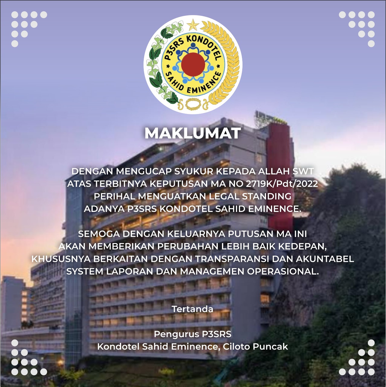 “Alhamdulillah saat ini putusan Mahkamah Agung No. 2719K/Pdt/2022 sudah memenangkan perkara kedudukan P3SRS Hotel Le Eminence. Secara sah diakui sesuai dengan Undang undang Rumah Susun No 20 Tahun 2011. Sepatutnya pengelola menghormati putusan MA dan menyerahkan hak pengelolaan hotel kepada P3SRS sesuai amanah undang undang” tambah Herman Saleh