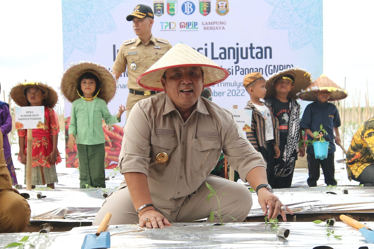 Gubernur Lampung Arinal Djunaidi melaksanakan Gerakan Tanam Cabai di Desa Trimulyo, Kabupaten Pesawaran, Selasa (15/11/2022).