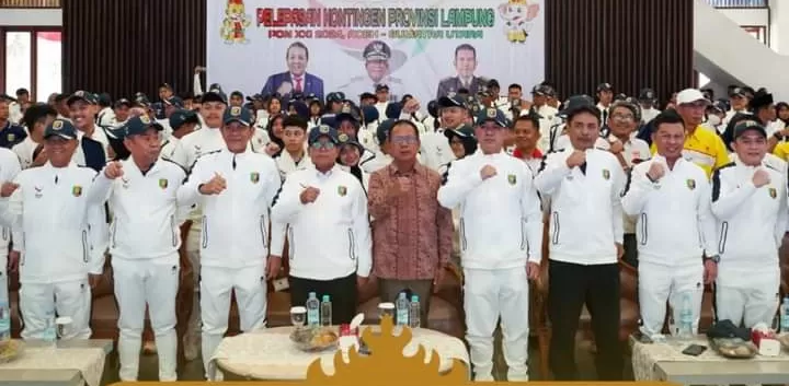 Kontingen secara resmi dilepas oleh Penjabat Gubernur Lampung Samsudin, Bendera Kontingen Lampung diserahkan sebagai tanda pelepasan Kontingen Lampung untuk mengikuti Pekan Olahraga Nasional (PON) XXI di Aceh dan Sumatera Utara, bertempat di Mahan Agung, Rumah Dinas Gubernur Lampung, Kamis (29/8/2024).