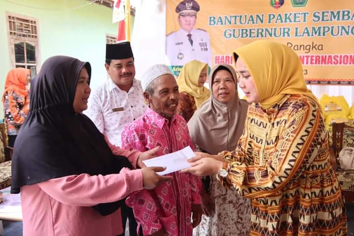 Lampung Selatan — Ketua Umum LKKS Provinsi Lampung, Riana Sari Arinal menyerahkan Bantuan Sosial Paket Sembako kepada warga masyarakat di Desa Pemanggilan – Kecamatan Natar, Lampung Selatan, Sabtu (19/8/2023).