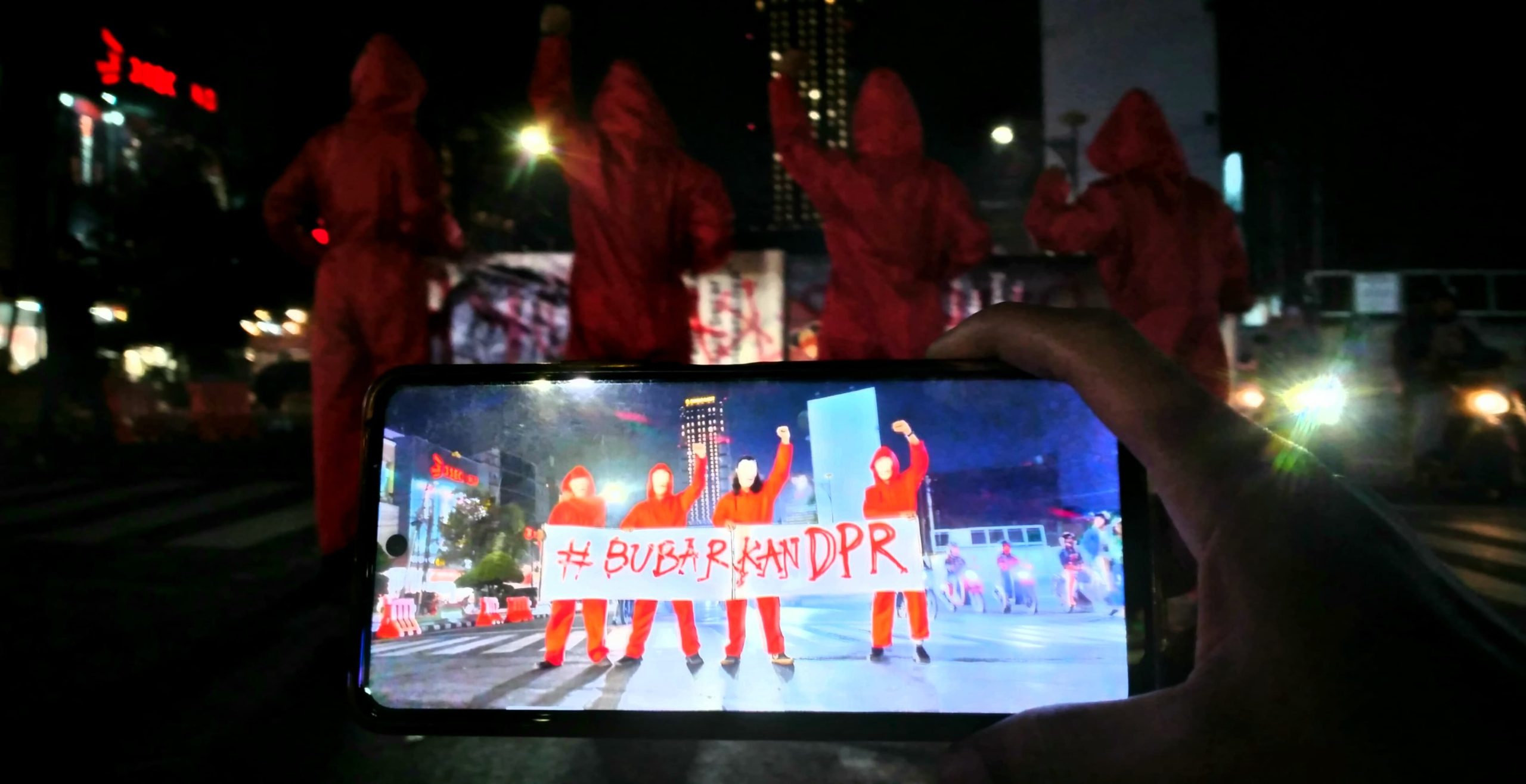 Dalam aksi tersebut, kelompok yang mengenakan kostum cosplay bertopeng Money Heist mengekspresikan ketidakpuasan mereka terhadap keputusan Baleg DPR.