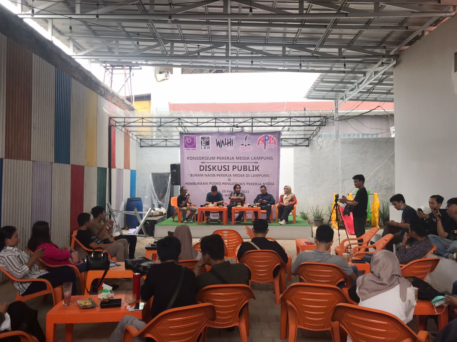 Sementara, diskusi publik bertajuk “Buram Nasib Pekerja Media di Lampung” itu dipandu jurnalis Lampung Post Umar Rabbani dengan Tiga narasumber. Ketiganya, Ketua Umum Aliansi Jurnalis Independen (AJI) Indonesia Sasmito Madrim, Wakil Direktur LBH Bandar Lampung Cik Ali, serta Kepala Bidang Hubungan Industrial dan Perlindungan Tenaga Kerja Dinas Tenaga Kerja (Disnaker) Kota Bandar Lampung Hardiansyah.