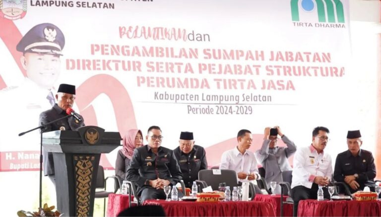 “Ya saya apresiasi, saya sengaja datang langsung dalam acara ini untuk menunjukkan apresiasi pemerintah daerah terhadap capaian oleh Perumda. Setelah konsisten dengan komitmen keuangan perusahaan tidak lagi disubsidi oleh APBD, Perumda juga di 2022 dinyatakan sudah mampu raih laba bersih sekitar Rp600 juta lebih. Padahal dahulu kita tahu keuangan PDAM selalu defisit, meski masih disubsidi oleh APBD,” ujar Bupati Lampung Selatan, Hi Nanang Ermanto dalam sambutannya pada acara pengambilan sumpah jabatan Direktur serta Pejabat Struktural Perumda Tirta Jasa periode 2024-2029 di Aula Sebuku Rumdin Bupati, Kamis 28 Desember 2023.