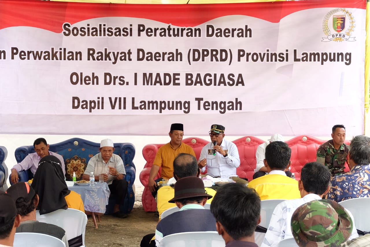 Made Bagiasa juga Wakil Ketua Fraksi Partai Golkar DPRD Lampung ini menyampaikan, sosialisasi Perda No.1/2016 tentang Rembug Desa, gencar dilakukan kepada masyarakat di Dapil VII Kabupaten Lampung Tengah.