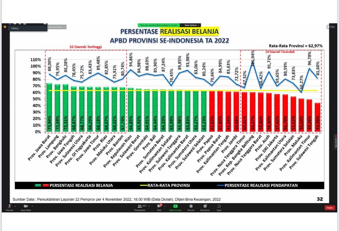 Mendagri menyampaikan 10 Provinsi dengan Persentase tertinggi realisasi APBD Provinsi se-Indonesia per 4 November TA 2022, Provinsi Jawa Barat, Lampung, Bengkulu, Jawa Tengah, Sulawesi Utara, DI Yogyakarta, Jawa Timur, Riau, Maluku Utara, dan Banten.