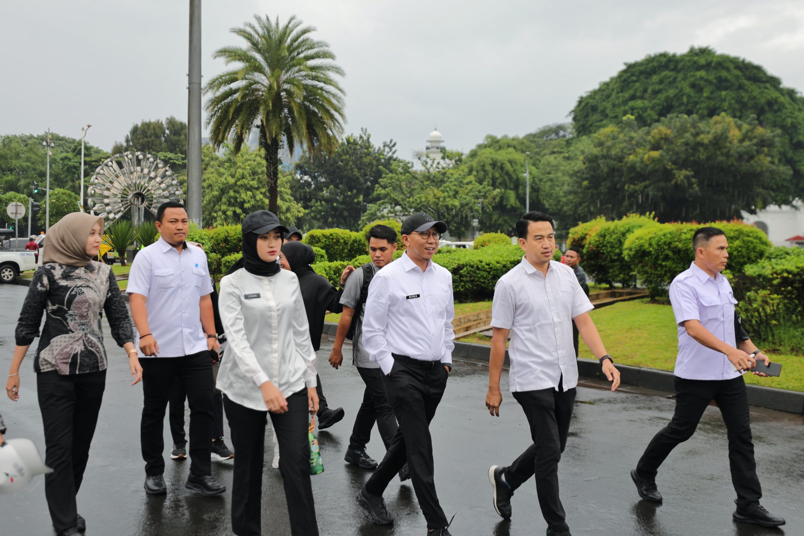 Meski diterpa hujan, suasana gladi tetap khikmad. Rahmat Mirzani dan Jihan Nurlela mengenakan pakaian hitam putih, berbaur bersama kepala daerah lainnya.