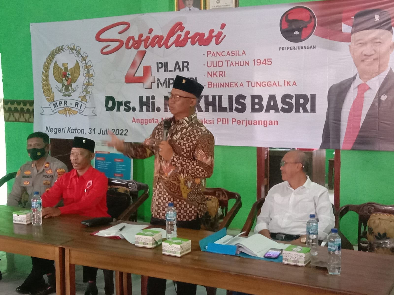 Pesawaran – Anggota MPR RI Fraksi PDI Perjuangan Dapil Lampung , Mukhlis Basri mengadakan kegiatan Sosialisasi 4 Pilar MPR RI kepada Kader, Pengurus Anak Ranting dan PAC PDI Perjuangan serta tokoh masyarakat Kecamatan Negeri Katon kabupaten Pesawaran di Balai Desa Bangun Sari, Minggu (31/7).
