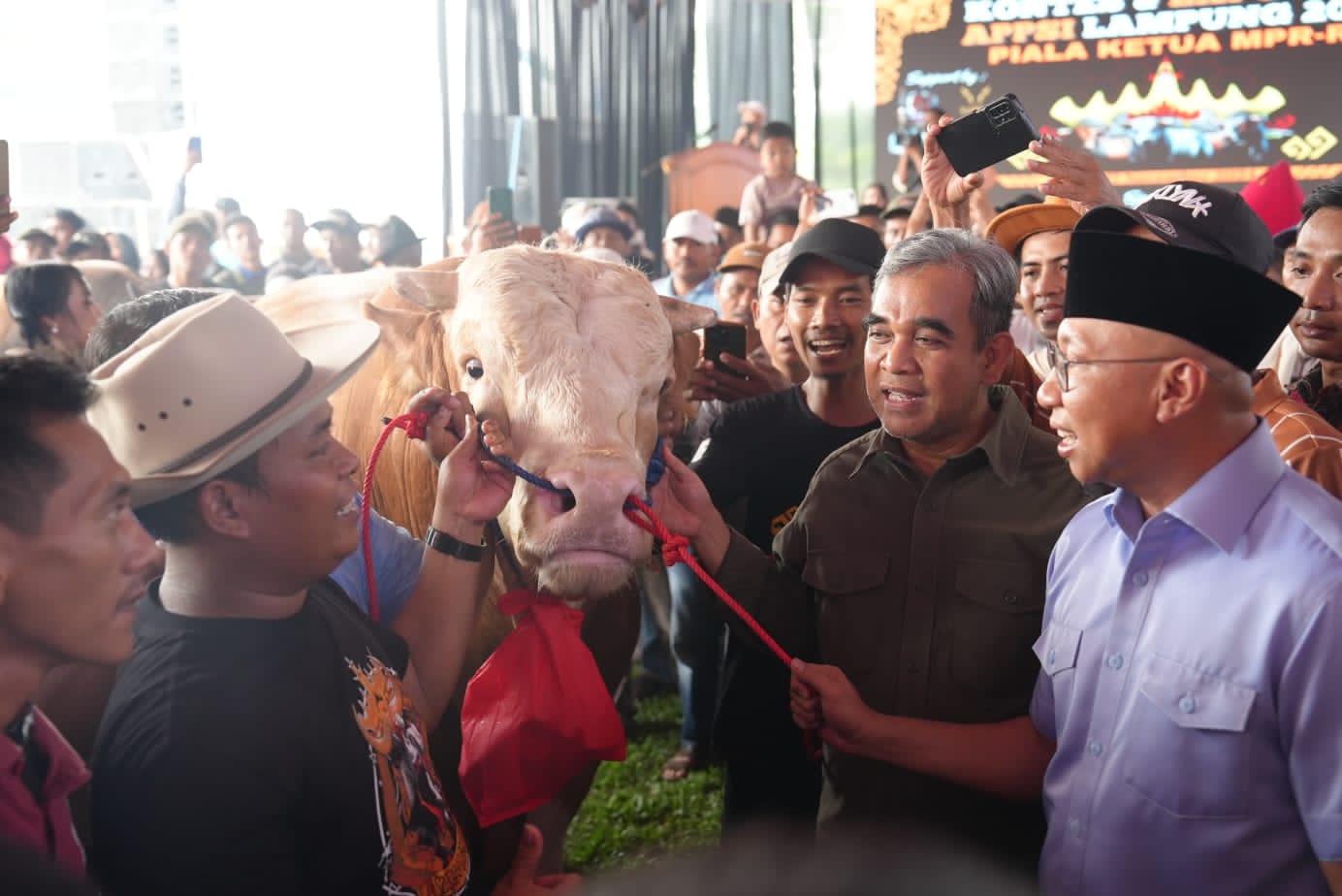 Bandarlampung – Ketua MPR RI yang juga Sekjen Partai Gerindra, Ahmad Muzani membeli sapi sapi Limosin dengan berat 1 ton lebih senilai Rp 100 juta rupiah. Lalu sapi tersebut kembali dilelang oleh Muzani dan laku terjual senilai Rp 250 juta rupiah oleh Calon Gubernur Lampung yang juga Ketua DPD Gerindra Lampung, Rahmat Mirzani Djausal.