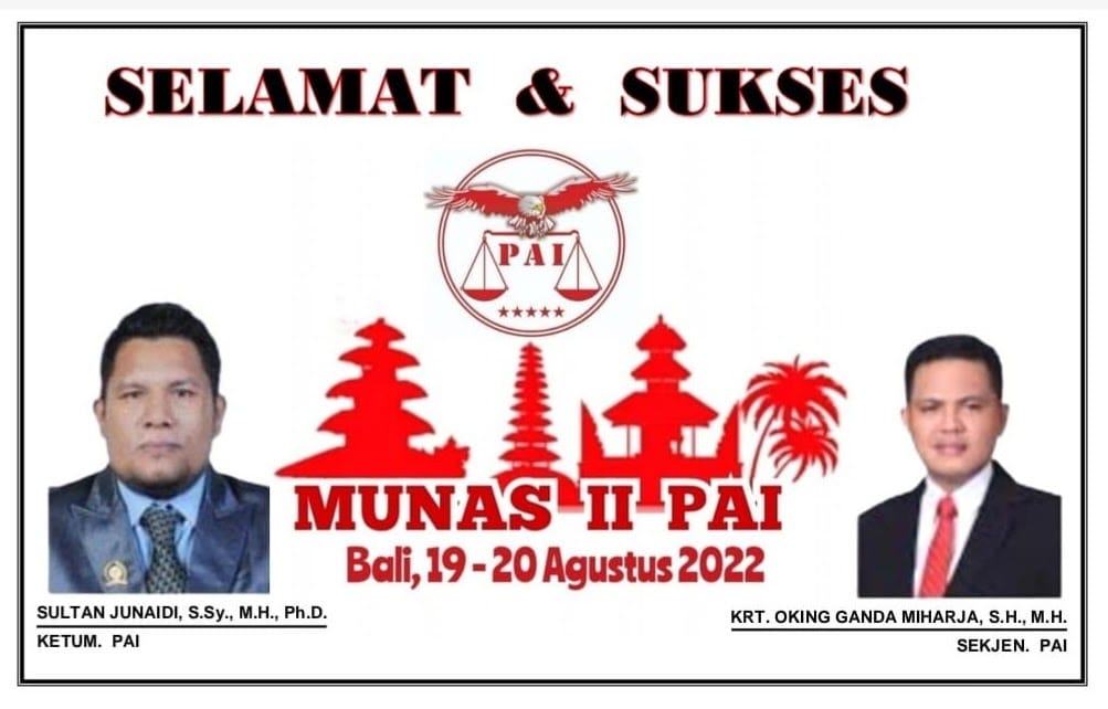 Ketua Umum Badan Pimpinan Pusat Perkumpulan Advocaten Indonesia (BPP PAI) Dr. Sultan Junaidi, S.Sy, MH, Ph.D. Mengatakan Munas bakal digelar di Provinsi Bali, dengan Tuan Rumah BPW PAI Bali. Munas akan diikuti oleh seluruh Pengurus dan anggota PAI se Indonesia.