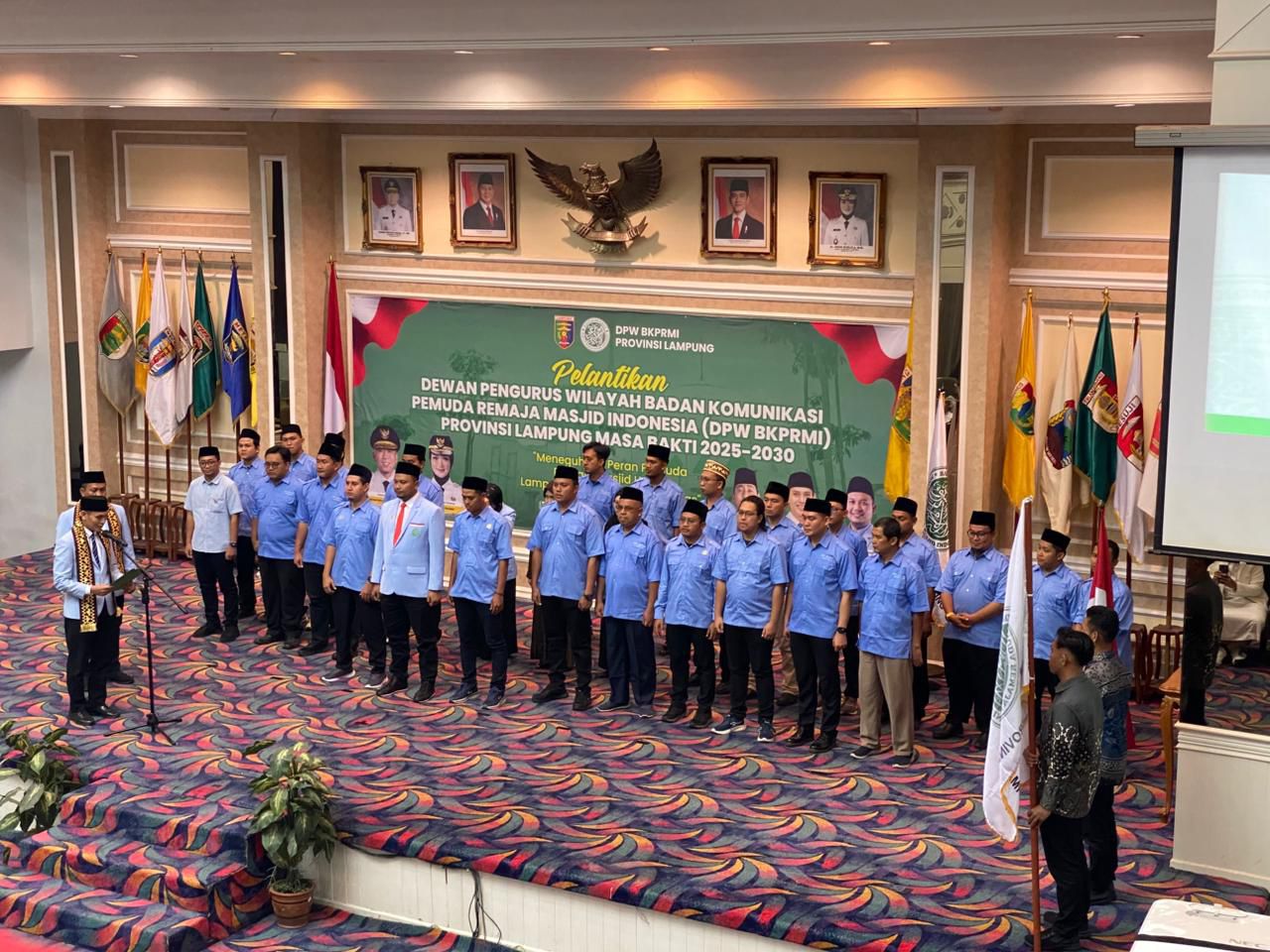 Bandar Lampung — Dewan Pengurus Wilayah Badan Komunikasi Pemuda Remaja Masjid Indonesia (DPW BKPRMI) Provinsi Lampung periode 2025–2029 resmi dilantik di Gedung Balai Keratun, Komplek Kantor Gubernur Lampung. Pelantikan dihadiri perwakilan Gubernur Lampung, Kadis Kominfo Provinsi Ganjar Jationo, serta jajaran Forkopimda dari Kodam, Polda, dan Kejati Lampung.