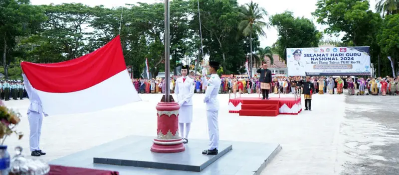 Pesan itu disampaikan Nanang Ermanto saat memimpin upacara peringatan Hari Guru Nasional dan HUT ke-79 PGRI tahun 2024 tingkat Kabupaten Lampung Selatan, yang digelar di Lapangan Korpri, Kalianda, Komplek Pemkab Lampung Selatan, Senin (25/11/2024).