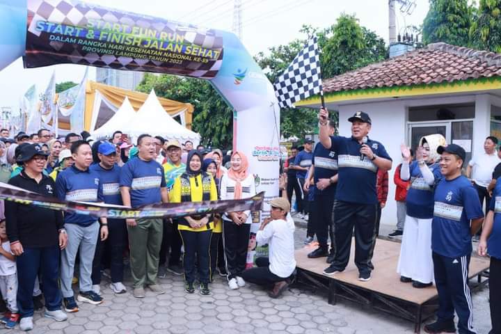 Bandar Lampung — Gubernur Lampung Arinal Djunaidi melepas Peserta Lomba Jalan Sehat Dalam rangka Hari Kesehatan Nasional ke-59 di halaman Kantor Dinas Kesehatan Provinsi Lampung, Minggu (19/11/2023).