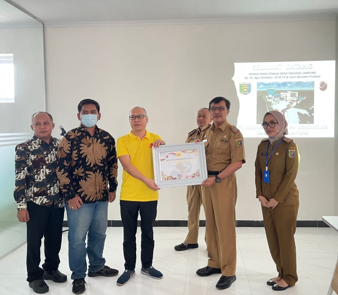 Penghargaan tersebut di serahkan oleh Dr. Agus Nompitu, S.E., M.T.P, (Kepala Disnaker Provinsi Lampung) kepada Zhang Nian (Direktur Operasional PT. IEA) dan didamping oleh ketua LKS Bipartit I Gede Putu Suardi dan Hadi Santoso (HRGA PT. IEA).