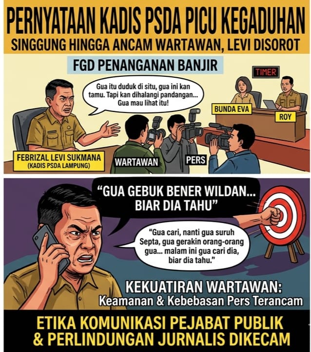 Bandarlampung — Pernyataan Kepala Dinas Pengelolaan Sumber Daya Air (PSDA) Provinsi Lampung, Febrizal Levi Sukmana, saat dikonfirmasi awak media justru memicu polemik baru. Alih-alih meredakan isu dugaan pengusiran jurnalis dalam forum FGD penanganan banjir, ucapan Levi melalui sambungan telepon malah menuai sorotan tajam.
