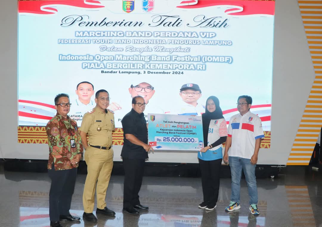 Bandar Lampung —- Pj. Gubernur Lampung, Samsudin menyerahkan penghargaan dan tali asih kepada Marching Band Federasi Youth Band Indonesia (FYBI) Pengurus Lampung, di Mahan Agung, Selasa (3/12/2024).
