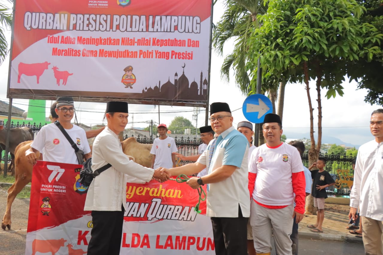 Hewan kurban diserahkan secara simbolis oleh Kapolda Lampung kepada Panitia Pelaksana Idul Adha 1444 H Polda Lampung. Adapun jumlah hewan kurban yang disembelih sebanyak 34 ekor hewan qurban terdiri dari, 32 Ekor Sapi dan 2 Kambing.