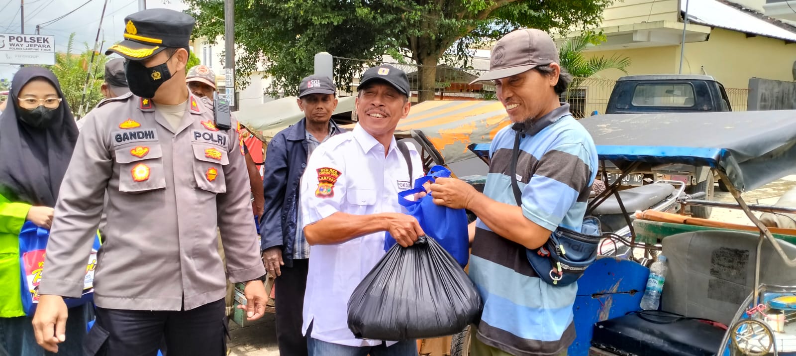 Lampung Timur — Polres Lampung Timur, Polda Lampung, bersama mahasiswa, Tokoh Agama, LSM Laskar Merah Putih, Pemuda Pancasila dan Kelompok Sadar (Pokdar) Kamtibmas, bagikan bantuan sosial (bansos) berupa ratusan paket sembako.