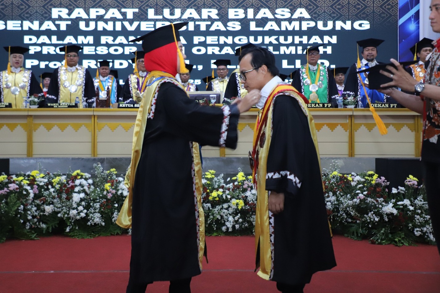 Bandarlampung – Rektor Universitas Lampung (Unila), Prof. Dr. Ir. Lusmeilia, D.E.A., I.P.M, resmi mengukuhkan Prof. Rudy, SH., LL.M., LL.D sebagai guru besar bidang ilmu hukum, Rabu (25/10). Dengan demikian, Prof Rudy pun resmi jadi guru besar termuda di Kampus Unila di usianya yang baru 42 tahun.