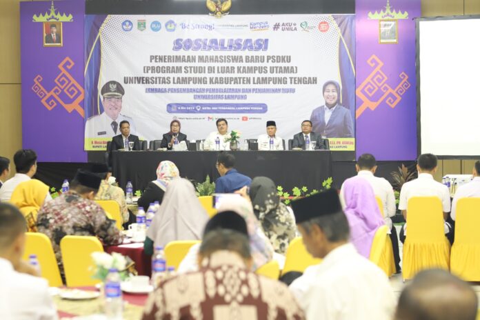 Bandarlampung – Rektor Universitas Lampung (Unila) Prof. Dr. Ir. Lusmeilia Afriani, D.E.A., IPM., ASEAN Eng., didampingi Wakil Rektor Bidang Akademik Dr. Eng. Sucipto Dwi Yuwono, S.Si., M.T., Ketua LP3M, Ketua LP2M, Kapus PSDKU Unila, membuka Sosialisasi Penerimaan Mahasiswa Baru Program Studi di Luar Kampus Utama (PSDKU) Unila, di Lampung Tengah, di Aula Hotel BBC Bandar Jaya, Rabu, 8 Mei 2024.