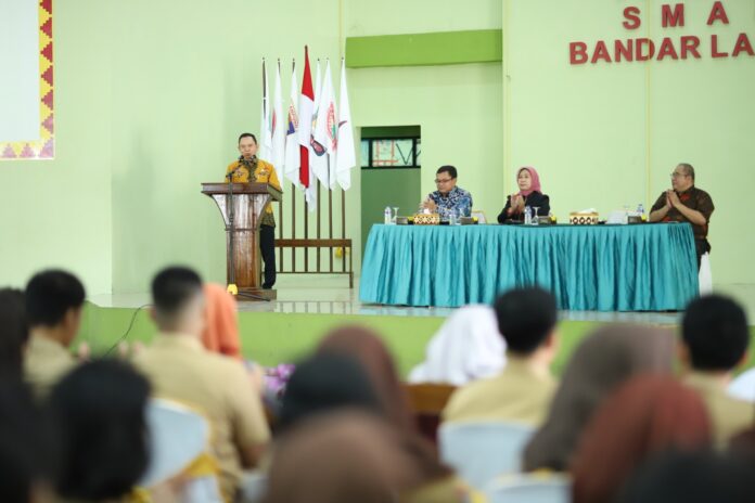 Bandarlampung – Rektor Universitas Lampung (Unila) Prof. Dr. Ir. Lusmeilia Afriani, D.E.A., IPM., ASEAN Eng., memimpin sosialisasi penerimaan mahasiswa baru (PMB) di SMAN 2 Bandar Lampung, Jumat (16/2). Sosialisasi bertujuan untuk memberikan informasi kepada siswa yang ingin melanjutkan studi di Unila.