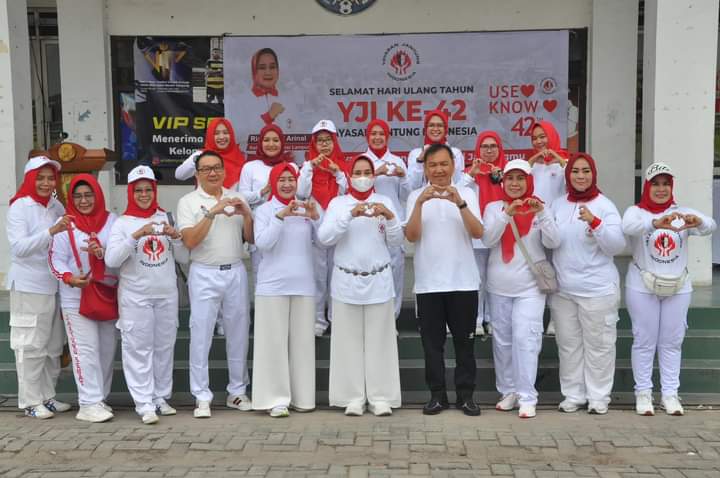 Bandar Lampung — Ketua Yayasan Jantung Indonesia (YJI) Cabang Provinsi Lampung, Riana Sari Arinal menghadiri Peringatan Hari Ulang Tahun Yayasan Jantung Indonesia (YJI) ke-42 Tahun 2023 bertempat di Pusat Kegiatan Olah Raga (PKOR) Way Halim, Sabtu (11/11/2023).